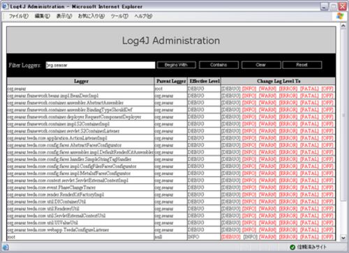 Log4jについて調べていたんだけど、dev2dev(BEA)より「Log4j管理JSP」というツールが公開されていることを知りました。http://www.beasys.co.jp/dev2dev/resourcelibrary/utilitiestools/adminmgmt.html#Log4jAdministrationJSP↑を使うと、ログレベルを動…